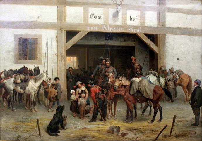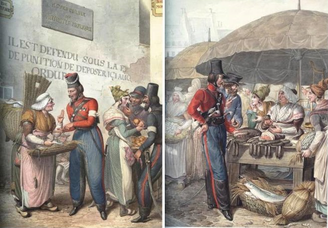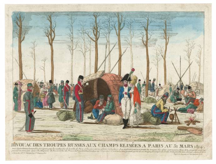 Казачьи полки разбили биваки прямо в городском саду на Елисейских Полях, которые в то время представляли собой густые зеленые рощи. Толпы зевак приходили сюда посмотреть, как казаки жарят мясо, варят на костре суп, спят на остатках сена, которое не съели лошади, используя седло в качестве подушки. Стоит сказать, что расположить казачий лагерь посреди города распорядилось высшее начальство, чтобы исключить возможность мародерства.
