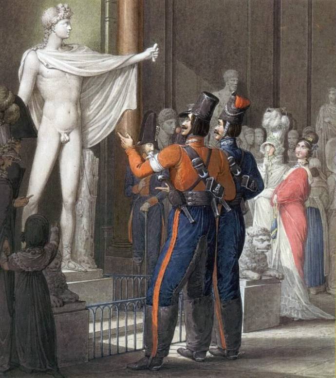 Александр I пресекал все случаи мародерства в Париже, но и к недоверию местных жителей относился сурово. «Я вступаю не врагом, а возвращаю вам мир и торговлю», — говорил он. Однажды при посещении одного из музеев он обратил внимание на то, что на некоторых постаментах не было статуй. Поинтересовавшись их судьбой, он услышал ответ начальника музея, что, когда над Парижем нависла опасность оккупации, статуи были отправлены в Орлеан.