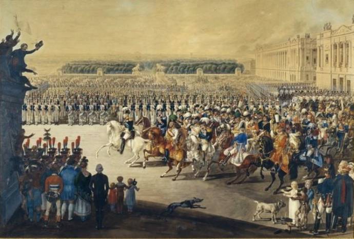 Воспоминания современников позволяют получить точную картину победного шествия. Первыми шли несколько эскадронов кавалерии, затем Александр I в сопровождении прусского короля и австрийского фельдмаршала Карла Шварценберга. За ними двигалась колонна, состоящая из отборной инфантерии, кавалерии и артиллерии императорской гвардии.